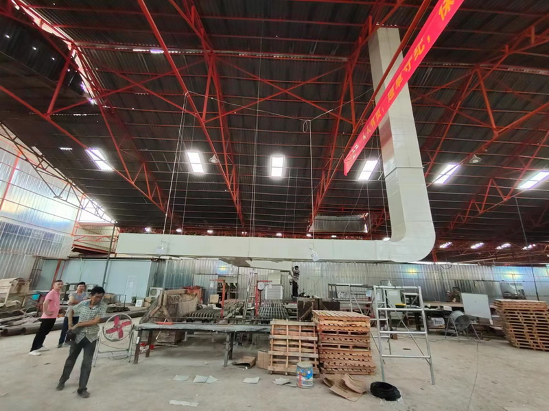 紙箱木架包裝廠概況:福建某紙箱木架包裝廠,高大鋼結構車間,做了集塵排煙,減少了粉塵,但一到夏季高溫車間十分悶熱,空氣不流通,員工工作汗流浹背,辛苦不止,生產效率還降低,該工廠需要做通風降溫,但市面上降溫產品選擇很多,了解后有點眼花繚亂,拿不定注意,后通過朋友介紹,聯系上我們江西分公司技術員,經過我們專…